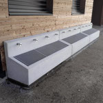 Die Anlage ist in drei Varianten erhältlich – mit 2, 4 oder 5 Waschplätzen. Je nach Ausführung variieren Länge und Anzahl der Wasseranschlüsse entsprechend (siehe Optionen).