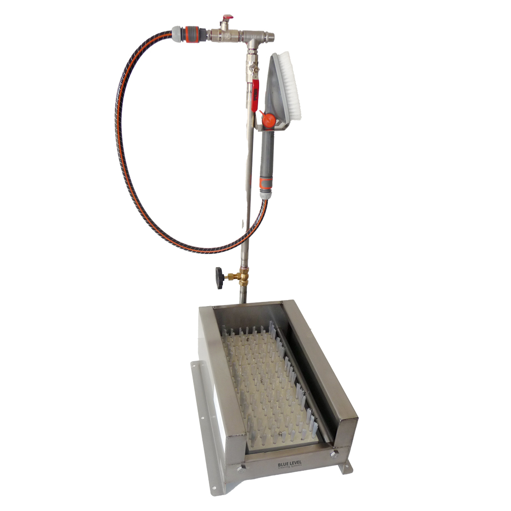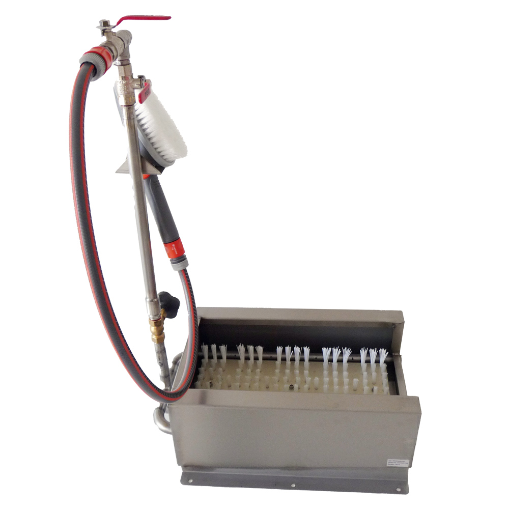 Gefertigt aus 2 mm starkem Edelstahlblech (1.4301), überzeugt die Anlage durch ihre robuste Ausführung. Die breite Sohlenbürste ist seitlich mit höheren Borsten versehen, um auch Sohlenränder zuverlässig zu reinigen. Zwei schwenkbare, tief montierte Sprühleisten erlauben die individuelle Anpassung der Wasserspritzhöhe – je nach Schuhart. Ein zusätzliches Ventil zur Regulierung der Wassermenge reduziert unerwünschte Spritzwasserbildung.