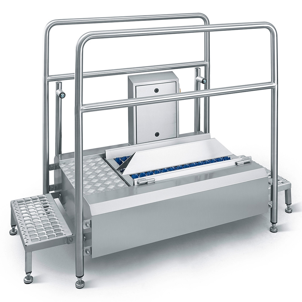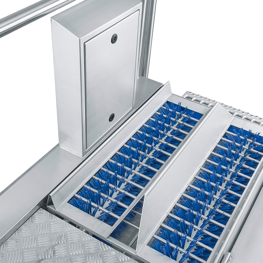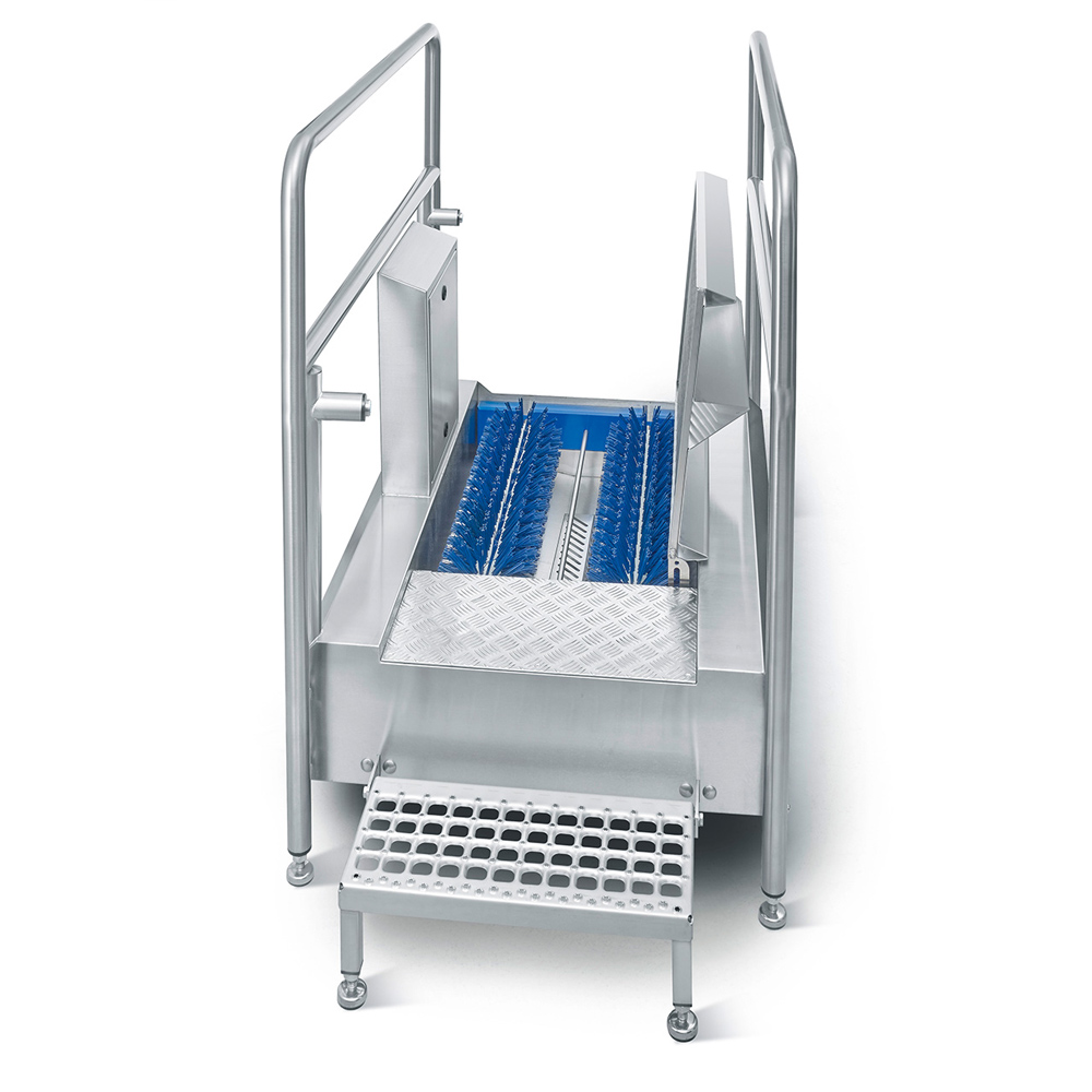 Die beidseitig angebrachten Handläufe stellen sicher, dass alle Mitarbeiter den Reiniger vollständig durchschreiten. In Kombination mit dem Seitenauftrittsschutz sorgen die Edelstahl-Geländer für höchste Sicherheit. Vor und nach der Anlage befinden sich rutschhemmende, abnehmbare Stufen für ein sicheres Betreten und Verlassen. Die Sohlenreinigungsanlage ist mit verstellbaren Edelstahl-Drehfüssen für die optimale Ausrichtung ausgestattet.