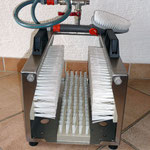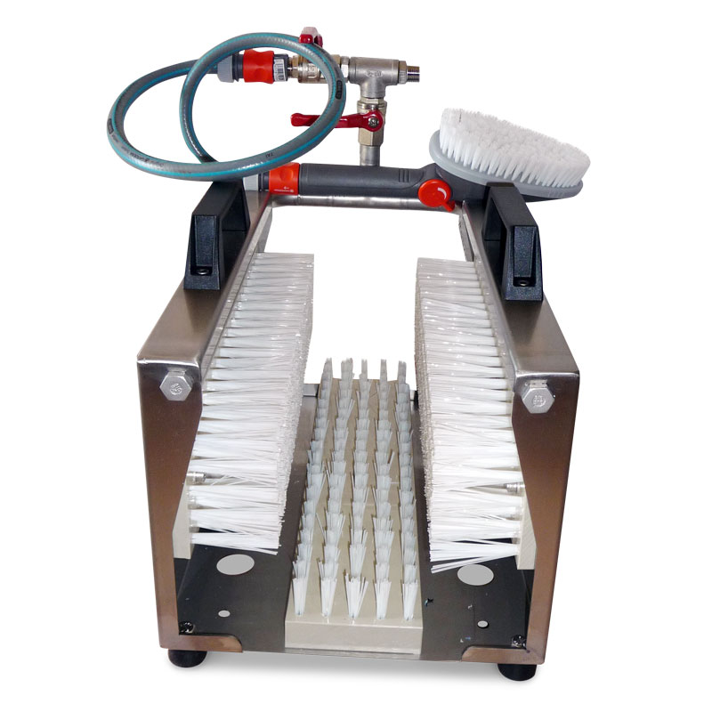 3 hochwertigen Bürsten zur Sohlen- und Sohlenrandreinigung lassen sich stark verschmutzte Stiefel schnell und gründlich an jedem erdenklichen Ort reinigen. Es wird nur ein ½ " Wasseranschluss